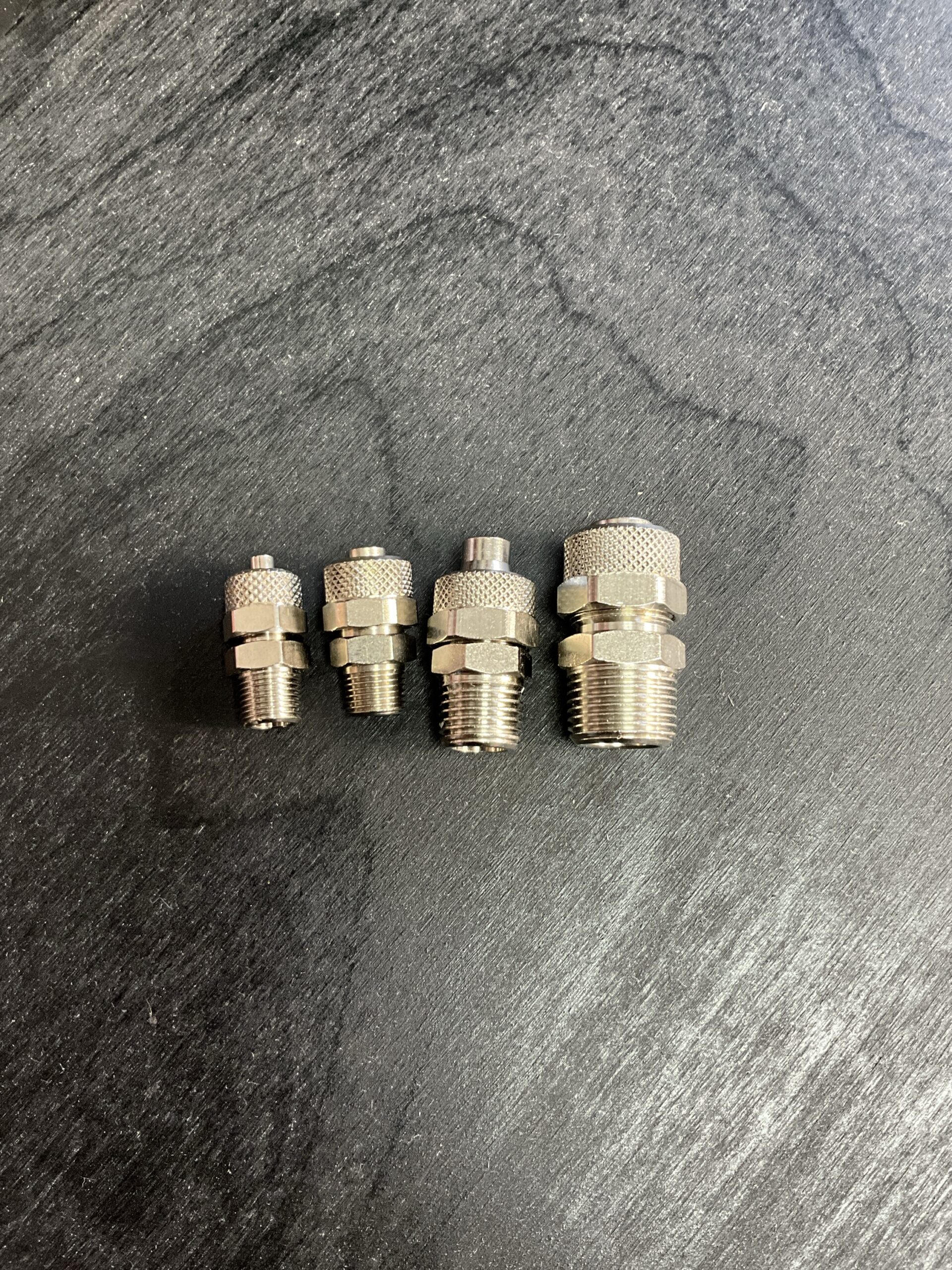Raccordo dritto maschio conico a calzamento per aria compressa realizzato in ottone nichelato . Sopporta temperature d’esercizio variabili da -40 ºC a + 150 ºC e pressioni fino a 25 BAR. Il raccordo pneumatico può essere utilizzato con tubi Rilsan PHL, Poliuretano PU e Teflon PTFE