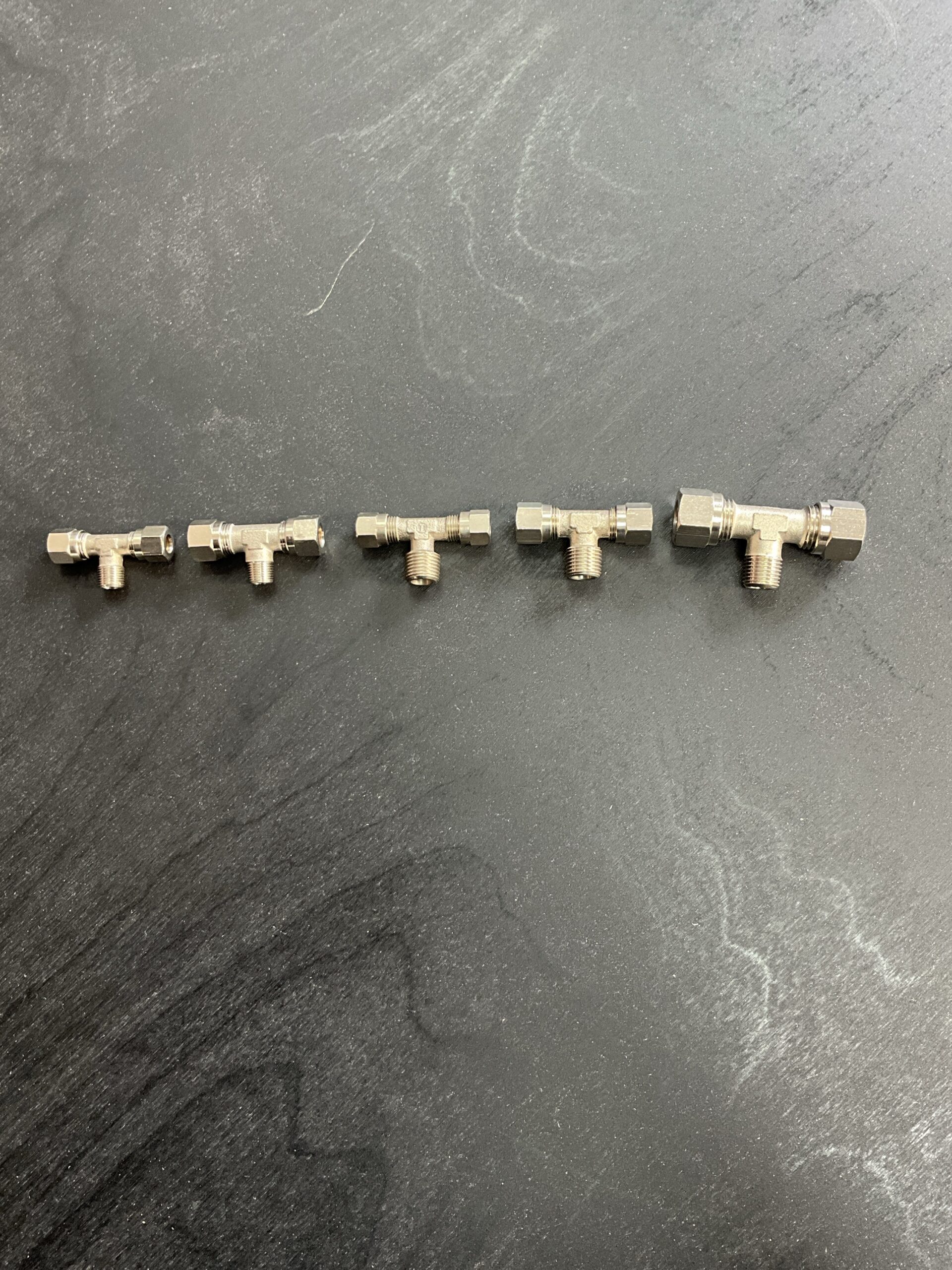 Raccordo ad ogiva T filettato a compressione, corpo in ottone nichelato e ogiva in ottone ricotto per tubi in rame, ferro,acciaio ,alluminio, ottone e rilsan, idoneo per acqua, olio e aria compressa